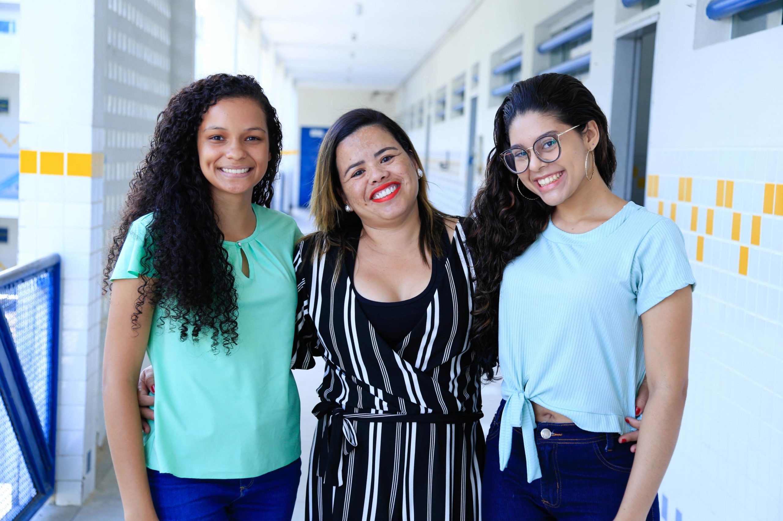 Professora Lívia Soares (centro) e suas alunas Letícia Campos (esquerda) e Alane Gonçalves (direita). Ambas atingiram a marca de 900 pontos no Enem. Foto: Divulgação.