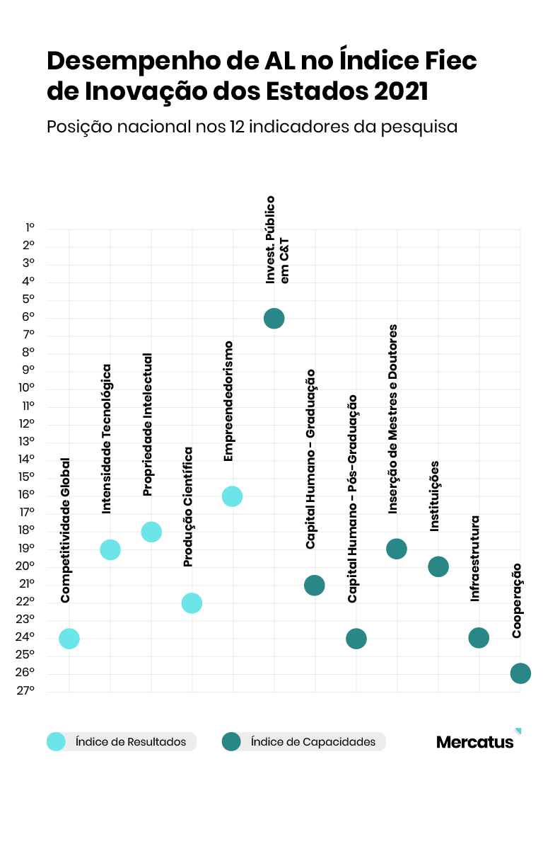 O pior resultado foi no indicador Cooperação, onde Alagoas ficou na penúltima posição. Este quesito avalia o número de parques tecnológicos, incubadoras e aceleradoras em relação à população total do estado.