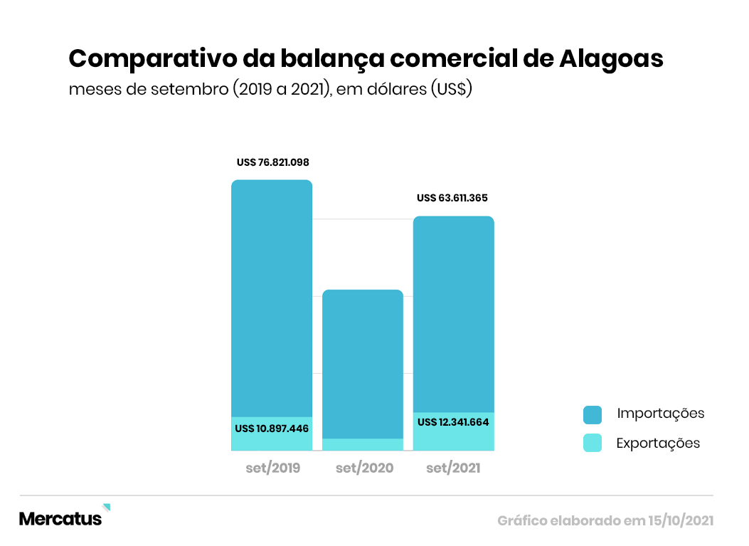 Mas, embora os números sejam promissores a nível nacional, o estado de Alagoas registrou déficits consideráveis quando analisados os números de importação e exportação do último mês divulgado pela Secex, setembro de 2021.