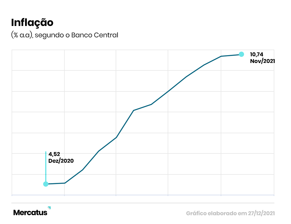 Os brasileiros viram tudo ficar mais caro no último ano, desde alimentação a transporte, e as contas cada vez mais difíceis de fechar. Nos últimos doze meses, a inflação no país seguiu em ritmo de ascensão, saindo de 4,52% em dezembro de 2020 para 10,74% em novembro de 2021.