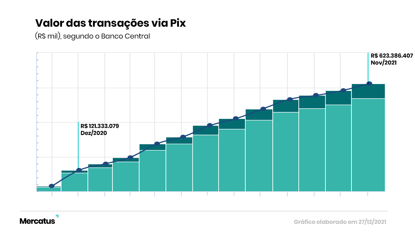 Em dezembro do ano passado, foram R$ 121,3 milhões transferidos instantaneamente. Um ano depois, em novembro de 2021, o montante registrado pelo BC já era de R$ 623,3 milhões.