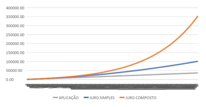 Como resultado teríamos acumulado cerca R$ 350 mil reais, com um esforço financeiro de R$ 36 mil. O que significa que R$ 314 mil foram gerados por juros compostos – o retorno do investimento. Por outro lado, caso a aplicação fosse em juros simples o valor seria aproximadamente de R$ 100 mil.
