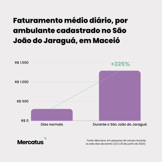A Mercatus realizou um levantamento com os ambulantes credenciados pela Prefeitura de Maceió para trabalhar no evento e constatou um aumento de 325% no faturamento diário médio, por empreendedor.