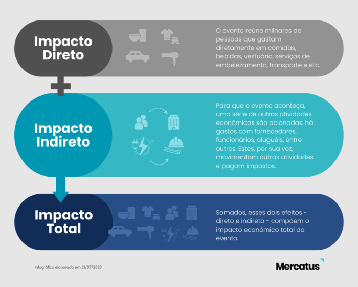 Há também a mensuração do impacto indireto, já que houve compras a fornecedores por parte das empresas, que por sua vez, ofertaram bens e serviços ao público do evento. Por fim, há ainda um impacto induzido percebido pelo consumo proveniente dos salários, aluguéis, entre outros pagamentos que foram realizados para que o evento acontecesse.
