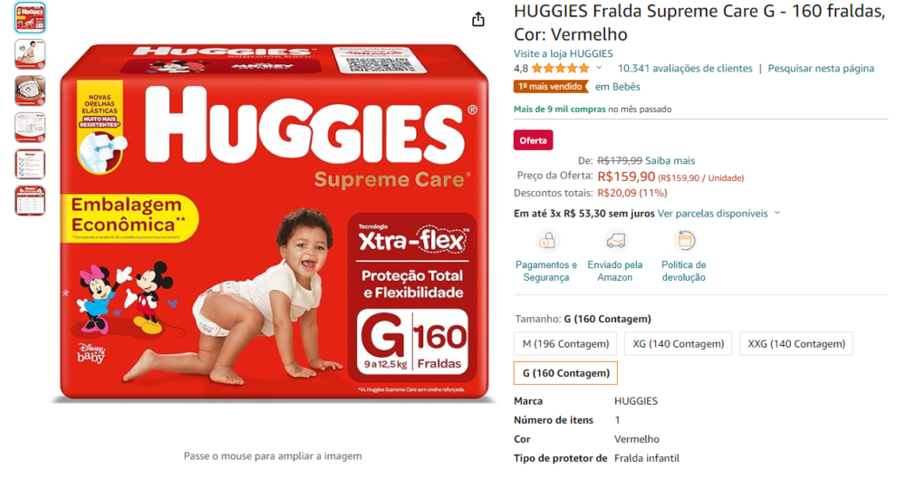 Um pacote com 160 unidades tamanho G da Huggies custa, na Amazon, por exemplo, R$ 159,99, ou seja, quase R$ 30 menos que o preço médio do varejo.