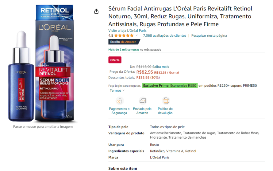 Produtos de beleza e para pele podem ser adquiridos com desconto na Amazon. Por exemplo, o sérum facial antirrugas L’Oréal Paris Revitalift Retinol Noturno de 30ml, que é encontrado por até R$ 131,35 em lojas especializadas, está disponível por R$ 82,95 na varejista norte-americana.