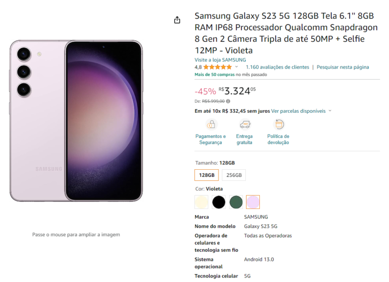 A Semana do Consumidor traz ofertas em diversos smartphones. Por exemplo, o Samsung Galaxy S23 de 128gb é vendido pela Amazon por R$ 3.324,00 à vista ou à prazo.