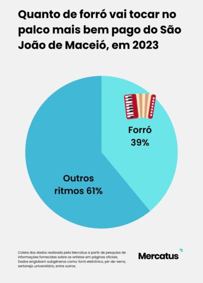 No Jaraguá, o palco com os artistas mais bem pagos da festa, o forró é o ritmo cantado por apenas 39% deles. São 16 artistas do forró e 25 de outros ritmos. Veja abaixo: